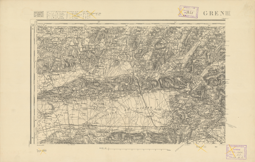 "Paris. Service Géographique de l'Armée, 1889. Ebbe origine dall'Edizione zincografica in quarti di foglio, stabilita dal 1879, per la carta detta de "L'Etat-Major". Infatti non rispondono più il sistema della riproduzione zincografica alle esigenze che la revisione dei fogli imponeva, per un inevitabile logoramento dei rami originali, fu proposta dapprima la correzione degli zinchi, ma questo, importando un lavoro lungo e gravoso, si adottò il procedimento galvanico. I rami galvanici ottenuti e corretti secondo questo sistema presero il nome di "édition type 1889". Allo scopo di facilitare l'incisione fu adoperata la suddivisione in quarti di foglio come per l'edizione zincografica. La revisione dei fogli di questo tipo non fu iniziata che nel 1893. Dal catalogo del S.G.A. risultano mancanti a questa edizione i dipartimenti della "Moselle", del "Bas-Rhin" e del "Haut-Rhin" per i quali non esiste che una edizione in fogli interi aggiornata nel 1901."