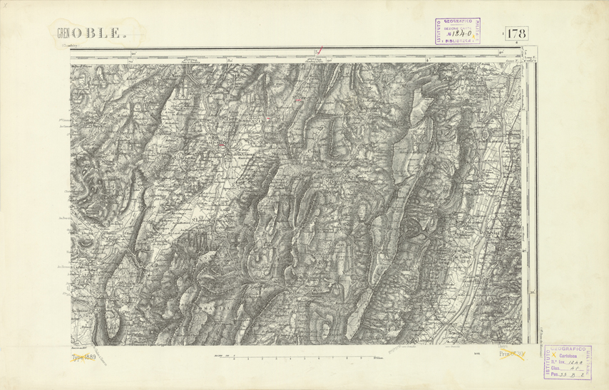 "Paris. Service Géographique de l'Armée, 1889. Ebbe origine dall'Edizione zincografica in quarti di foglio, stabilita dal 1879, per la carta detta de "L'Etat-Major". Infatti non rispondono più il sistema della riproduzione zincografica alle esigenze che la revisione dei fogli imponeva, per un inevitabile logoramento dei rami originali, fu proposta dapprima la correzione degli zinchi, ma questo, importando un lavoro lungo e gravoso, si adottò il procedimento galvanico. I rami galvanici ottenuti e corretti secondo questo sistema presero il nome di "édition type 1889". Allo scopo di facilitare l'incisione fu adoperata la suddivisione in quarti di foglio come per l'edizione zincografica. La revisione dei fogli di questo tipo non fu iniziata che nel 1893. Dal catalogo del S.G.A. risultano mancanti a questa edizione i dipartimenti della "Moselle", del "Bas-Rhin" e del "Haut-Rhin" per i quali non esiste che una edizione in fogli interi aggiornata nel 1901."