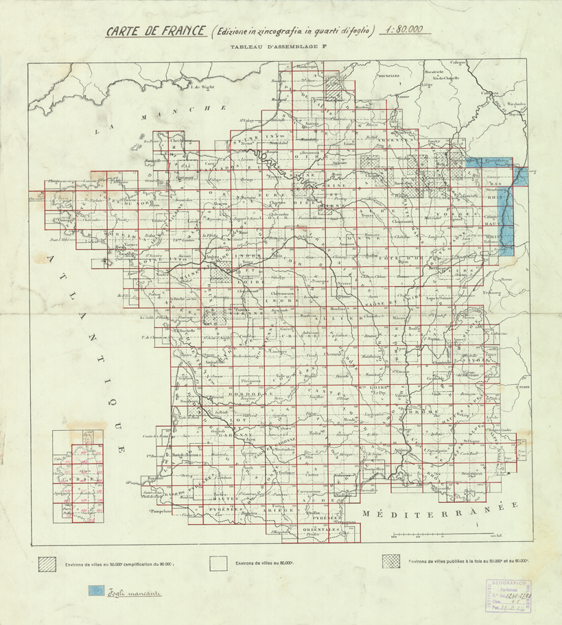 "Paris. Service Géographique de l'Armée, 1889. Ebbe origine dall'Edizione zincografica in quarti di foglio, stabilita dal 1879, per la carta detta de "L'Etat-Major". Infatti non rispondono più il sistema della riproduzione zincografica alle esigenze che la revisione dei fogli imponeva, per un inevitabile logoramento dei rami originali, fu proposta dapprima la correzione degli zinchi, ma questo, importando un lavoro lungo e gravoso, si adottò il procedimento galvanico. I rami galvanici ottenuti e corretti secondo questo sistema presero il nome di "édition type 1889". Allo scopo di facilitare l'incisione fu adoperata la suddivisione in quarti di foglio come per l'edizione zincografica. La revisione dei fogli di questo tipo non fu iniziata che nel 1893. Dal catalogo del S.G.A. risultano mancanti a questa edizione i dipartimenti della "Moselle", del "Bas-Rhin" e del "Haut-Rhin" per i quali non esiste che una edizione in fogli interi aggiornata nel 1901."