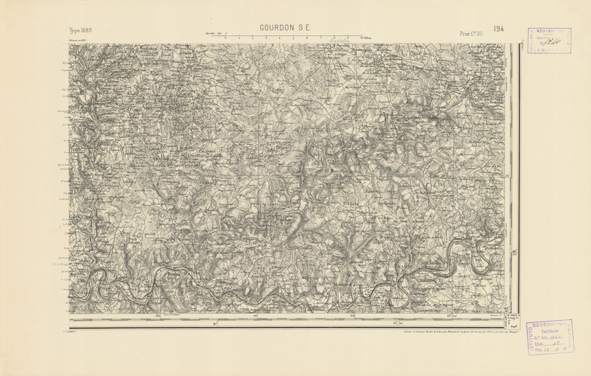 "Paris. Service Géographique de l'Armée, 1889. Ebbe origine dall'Edizione zincografica in quarti di foglio, stabilita dal 1879, per la carta detta de "L'Etat-Major". Infatti non rispondono più il sistema della riproduzione zincografica alle esigenze che la revisione dei fogli imponeva, per un inevitabile logoramento dei rami originali, fu proposta dapprima la correzione degli zinchi, ma questo, importando un lavoro lungo e gravoso, si adottò il procedimento galvanico. I rami galvanici ottenuti e corretti secondo questo sistema presero il nome di "édition type 1889". Allo scopo di facilitare l'incisione fu adoperata la suddivisione in quarti di foglio come per l'edizione zincografica. La revisione dei fogli di questo tipo non fu iniziata che nel 1893. Dal catalogo del S.G.A. risultano mancanti a questa edizione i dipartimenti della "Moselle", del "Bas-Rhin" e del "Haut-Rhin" per i quali non esiste che una edizione in fogli interi aggiornata nel 1901."