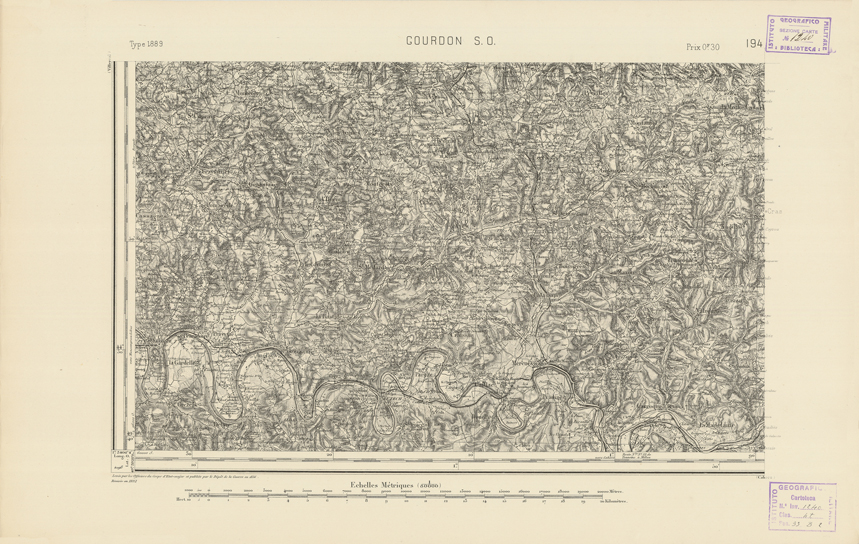 "Paris. Service Géographique de l'Armée, 1889. Ebbe origine dall'Edizione zincografica in quarti di foglio, stabilita dal 1879, per la carta detta de "L'Etat-Major". Infatti non rispondono più il sistema della riproduzione zincografica alle esigenze che la revisione dei fogli imponeva, per un inevitabile logoramento dei rami originali, fu proposta dapprima la correzione degli zinchi, ma questo, importando un lavoro lungo e gravoso, si adottò il procedimento galvanico. I rami galvanici ottenuti e corretti secondo questo sistema presero il nome di "édition type 1889". Allo scopo di facilitare l'incisione fu adoperata la suddivisione in quarti di foglio come per l'edizione zincografica. La revisione dei fogli di questo tipo non fu iniziata che nel 1893. Dal catalogo del S.G.A. risultano mancanti a questa edizione i dipartimenti della "Moselle", del "Bas-Rhin" e del "Haut-Rhin" per i quali non esiste che una edizione in fogli interi aggiornata nel 1901."