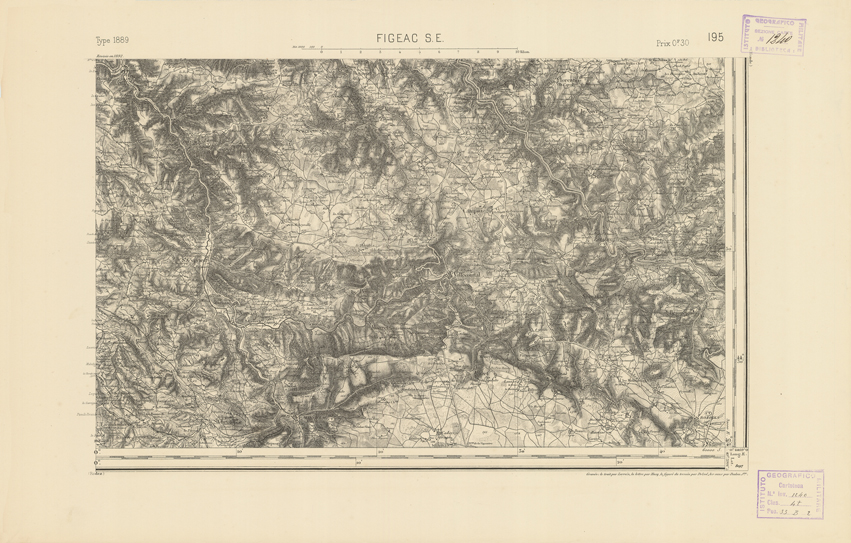 "Paris. Service Géographique de l'Armée, 1889. Ebbe origine dall'Edizione zincografica in quarti di foglio, stabilita dal 1879, per la carta detta de "L'Etat-Major". Infatti non rispondono più il sistema della riproduzione zincografica alle esigenze che la revisione dei fogli imponeva, per un inevitabile logoramento dei rami originali, fu proposta dapprima la correzione degli zinchi, ma questo, importando un lavoro lungo e gravoso, si adottò il procedimento galvanico. I rami galvanici ottenuti e corretti secondo questo sistema presero il nome di "édition type 1889". Allo scopo di facilitare l'incisione fu adoperata la suddivisione in quarti di foglio come per l'edizione zincografica. La revisione dei fogli di questo tipo non fu iniziata che nel 1893. Dal catalogo del S.G.A. risultano mancanti a questa edizione i dipartimenti della "Moselle", del "Bas-Rhin" e del "Haut-Rhin" per i quali non esiste che una edizione in fogli interi aggiornata nel 1901."