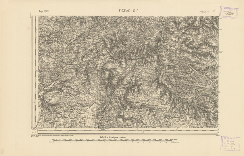 "Paris. Service Géographique de l'Armée, 1889. Ebbe origine dall'Edizione zincografica in quarti di foglio, stabilita dal 1879, per la carta detta de "L'Etat-Major". Infatti non rispondono più il sistema della riproduzione zincografica alle esigenze che la revisione dei fogli imponeva, per un inevitabile logoramento dei rami originali, fu proposta dapprima la correzione degli zinchi, ma questo, importando un lavoro lungo e gravoso, si adottò il procedimento galvanico. I rami galvanici ottenuti e corretti secondo questo sistema presero il nome di "édition type 1889". Allo scopo di facilitare l'incisione fu adoperata la suddivisione in quarti di foglio come per l'edizione zincografica. La revisione dei fogli di questo tipo non fu iniziata che nel 1893. Dal catalogo del S.G.A. risultano mancanti a questa edizione i dipartimenti della "Moselle", del "Bas-Rhin" e del "Haut-Rhin" per i quali non esiste che una edizione in fogli interi aggiornata nel 1901."
