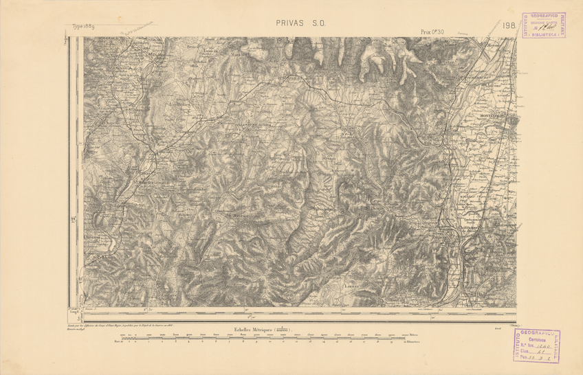 "Paris. Service Géographique de l'Armée, 1889. Ebbe origine dall'Edizione zincografica in quarti di foglio, stabilita dal 1879, per la carta detta de "L'Etat-Major". Infatti non rispondono più il sistema della riproduzione zincografica alle esigenze che la revisione dei fogli imponeva, per un inevitabile logoramento dei rami originali, fu proposta dapprima la correzione degli zinchi, ma questo, importando un lavoro lungo e gravoso, si adottò il procedimento galvanico. I rami galvanici ottenuti e corretti secondo questo sistema presero il nome di "édition type 1889". Allo scopo di facilitare l'incisione fu adoperata la suddivisione in quarti di foglio come per l'edizione zincografica. La revisione dei fogli di questo tipo non fu iniziata che nel 1893. Dal catalogo del S.G.A. risultano mancanti a questa edizione i dipartimenti della "Moselle", del "Bas-Rhin" e del "Haut-Rhin" per i quali non esiste che una edizione in fogli interi aggiornata nel 1901."