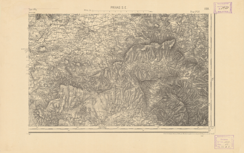 "Paris. Service Géographique de l'Armée, 1889. Ebbe origine dall'Edizione zincografica in quarti di foglio, stabilita dal 1879, per la carta detta de "L'Etat-Major". Infatti non rispondono più il sistema della riproduzione zincografica alle esigenze che la revisione dei fogli imponeva, per un inevitabile logoramento dei rami originali, fu proposta dapprima la correzione degli zinchi, ma questo, importando un lavoro lungo e gravoso, si adottò il procedimento galvanico. I rami galvanici ottenuti e corretti secondo questo sistema presero il nome di "édition type 1889". Allo scopo di facilitare l'incisione fu adoperata la suddivisione in quarti di foglio come per l'edizione zincografica. La revisione dei fogli di questo tipo non fu iniziata che nel 1893. Dal catalogo del S.G.A. risultano mancanti a questa edizione i dipartimenti della "Moselle", del "Bas-Rhin" e del "Haut-Rhin" per i quali non esiste che una edizione in fogli interi aggiornata nel 1901."