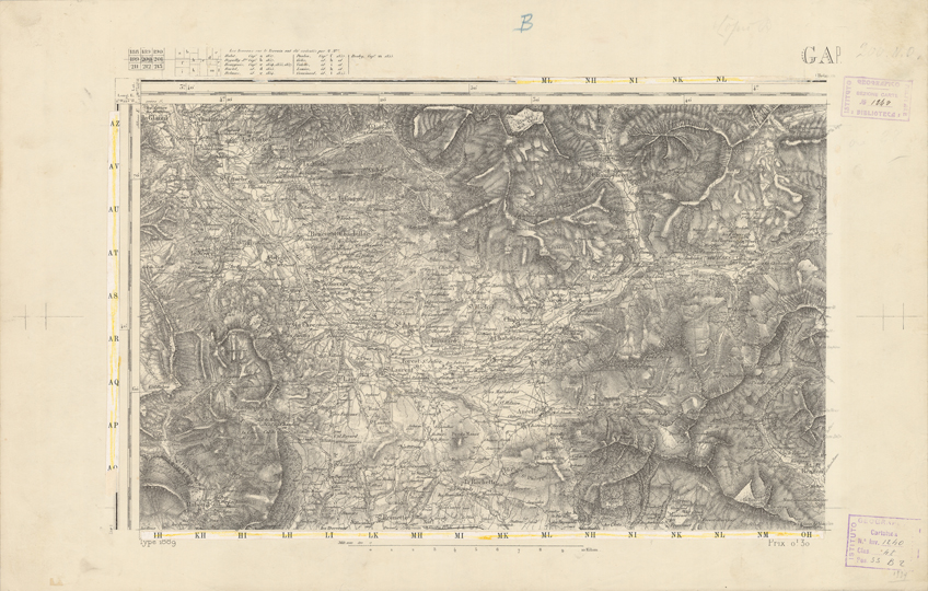 "Paris. Service Géographique de l'Armée, 1889. Ebbe origine dall'Edizione zincografica in quarti di foglio, stabilita dal 1879, per la carta detta de "L'Etat-Major". Infatti non rispondono più il sistema della riproduzione zincografica alle esigenze che la revisione dei fogli imponeva, per un inevitabile logoramento dei rami originali, fu proposta dapprima la correzione degli zinchi, ma questo, importando un lavoro lungo e gravoso, si adottò il procedimento galvanico. I rami galvanici ottenuti e corretti secondo questo sistema presero il nome di "édition type 1889". Allo scopo di facilitare l'incisione fu adoperata la suddivisione in quarti di foglio come per l'edizione zincografica. La revisione dei fogli di questo tipo non fu iniziata che nel 1893. Dal catalogo del S.G.A. risultano mancanti a questa edizione i dipartimenti della "Moselle", del "Bas-Rhin" e del "Haut-Rhin" per i quali non esiste che una edizione in fogli interi aggiornata nel 1901."