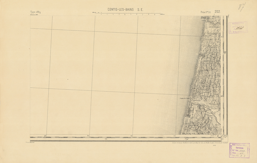 "Paris. Service Géographique de l'Armée, 1889. Ebbe origine dall'Edizione zincografica in quarti di foglio, stabilita dal 1879, per la carta detta de "L'Etat-Major". Infatti non rispondono più il sistema della riproduzione zincografica alle esigenze che la revisione dei fogli imponeva, per un inevitabile logoramento dei rami originali, fu proposta dapprima la correzione degli zinchi, ma questo, importando un lavoro lungo e gravoso, si adottò il procedimento galvanico. I rami galvanici ottenuti e corretti secondo questo sistema presero il nome di "édition type 1889". Allo scopo di facilitare l'incisione fu adoperata la suddivisione in quarti di foglio come per l'edizione zincografica. La revisione dei fogli di questo tipo non fu iniziata che nel 1893. Dal catalogo del S.G.A. risultano mancanti a questa edizione i dipartimenti della "Moselle", del "Bas-Rhin" e del "Haut-Rhin" per i quali non esiste che una edizione in fogli interi aggiornata nel 1901."