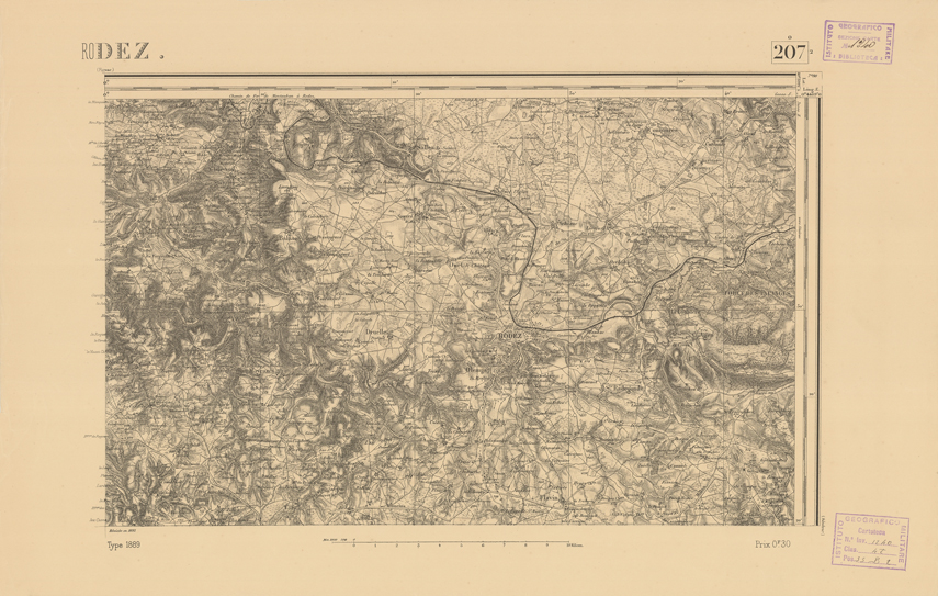 "Paris. Service Géographique de l'Armée, 1889. Ebbe origine dall'Edizione zincografica in quarti di foglio, stabilita dal 1879, per la carta detta de "L'Etat-Major". Infatti non rispondono più il sistema della riproduzione zincografica alle esigenze che la revisione dei fogli imponeva, per un inevitabile logoramento dei rami originali, fu proposta dapprima la correzione degli zinchi, ma questo, importando un lavoro lungo e gravoso, si adottò il procedimento galvanico. I rami galvanici ottenuti e corretti secondo questo sistema presero il nome di "édition type 1889". Allo scopo di facilitare l'incisione fu adoperata la suddivisione in quarti di foglio come per l'edizione zincografica. La revisione dei fogli di questo tipo non fu iniziata che nel 1893. Dal catalogo del S.G.A. risultano mancanti a questa edizione i dipartimenti della "Moselle", del "Bas-Rhin" e del "Haut-Rhin" per i quali non esiste che una edizione in fogli interi aggiornata nel 1901."
