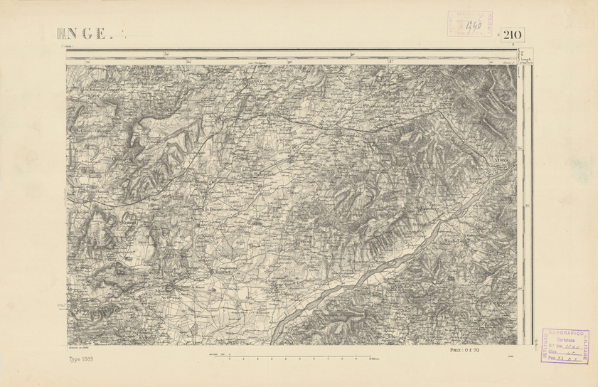 "Paris. Service Géographique de l'Armée, 1889. Ebbe origine dall'Edizione zincografica in quarti di foglio, stabilita dal 1879, per la carta detta de "L'Etat-Major". Infatti non rispondono più il sistema della riproduzione zincografica alle esigenze che la revisione dei fogli imponeva, per un inevitabile logoramento dei rami originali, fu proposta dapprima la correzione degli zinchi, ma questo, importando un lavoro lungo e gravoso, si adottò il procedimento galvanico. I rami galvanici ottenuti e corretti secondo questo sistema presero il nome di "édition type 1889". Allo scopo di facilitare l'incisione fu adoperata la suddivisione in quarti di foglio come per l'edizione zincografica. La revisione dei fogli di questo tipo non fu iniziata che nel 1893. Dal catalogo del S.G.A. risultano mancanti a questa edizione i dipartimenti della "Moselle", del "Bas-Rhin" e del "Haut-Rhin" per i quali non esiste che una edizione in fogli interi aggiornata nel 1901."