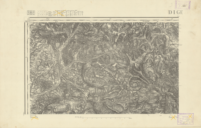 "Paris. Service Géographique de l'Armée, 1889. Ebbe origine dall'Edizione zincografica in quarti di foglio, stabilita dal 1879, per la carta detta de "L'Etat-Major". Infatti non rispondono più il sistema della riproduzione zincografica alle esigenze che la revisione dei fogli imponeva, per un inevitabile logoramento dei rami originali, fu proposta dapprima la correzione degli zinchi, ma questo, importando un lavoro lungo e gravoso, si adottò il procedimento galvanico. I rami galvanici ottenuti e corretti secondo questo sistema presero il nome di "édition type 1889". Allo scopo di facilitare l'incisione fu adoperata la suddivisione in quarti di foglio come per l'edizione zincografica. La revisione dei fogli di questo tipo non fu iniziata che nel 1893. Dal catalogo del S.G.A. risultano mancanti a questa edizione i dipartimenti della "Moselle", del "Bas-Rhin" e del "Haut-Rhin" per i quali non esiste che una edizione in fogli interi aggiornata nel 1901."