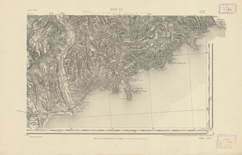 "Paris. Service Géographique de l'Armée, 1889. Ebbe origine dall'Edizione zincografica in quarti di foglio, stabilita dal 1879, per la carta detta de "L'Etat-Major". Infatti non rispondono più il sistema della riproduzione zincografica alle esigenze che la revisione dei fogli imponeva, per un inevitabile logoramento dei rami originali, fu proposta dapprima la correzione degli zinchi, ma questo, importando un lavoro lungo e gravoso, si adottò il procedimento galvanico. I rami galvanici ottenuti e corretti secondo questo sistema presero il nome di "édition type 1889". Allo scopo di facilitare l'incisione fu adoperata la suddivisione in quarti di foglio come per l'edizione zincografica. La revisione dei fogli di questo tipo non fu iniziata che nel 1893. Dal catalogo del S.G.A. risultano mancanti a questa edizione i dipartimenti della "Moselle", del "Bas-Rhin" e del "Haut-Rhin" per i quali non esiste che una edizione in fogli interi aggiornata nel 1901."