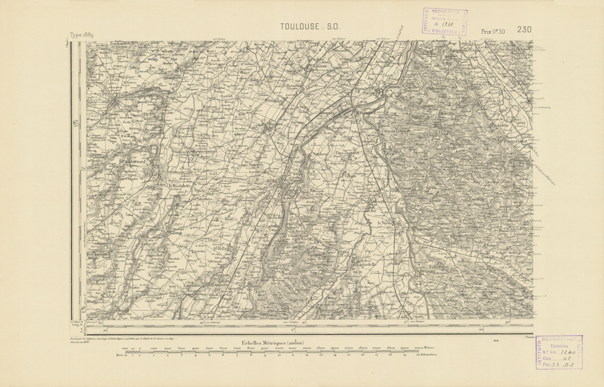 "Paris. Service Géographique de l'Armée, 1889. Ebbe origine dall'Edizione zincografica in quarti di foglio, stabilita dal 1879, per la carta detta de "L'Etat-Major". Infatti non rispondono più il sistema della riproduzione zincografica alle esigenze che la revisione dei fogli imponeva, per un inevitabile logoramento dei rami originali, fu proposta dapprima la correzione degli zinchi, ma questo, importando un lavoro lungo e gravoso, si adottò il procedimento galvanico. I rami galvanici ottenuti e corretti secondo questo sistema presero il nome di "édition type 1889". Allo scopo di facilitare l'incisione fu adoperata la suddivisione in quarti di foglio come per l'edizione zincografica. La revisione dei fogli di questo tipo non fu iniziata che nel 1893. Dal catalogo del S.G.A. risultano mancanti a questa edizione i dipartimenti della "Moselle", del "Bas-Rhin" e del "Haut-Rhin" per i quali non esiste che una edizione in fogli interi aggiornata nel 1901."