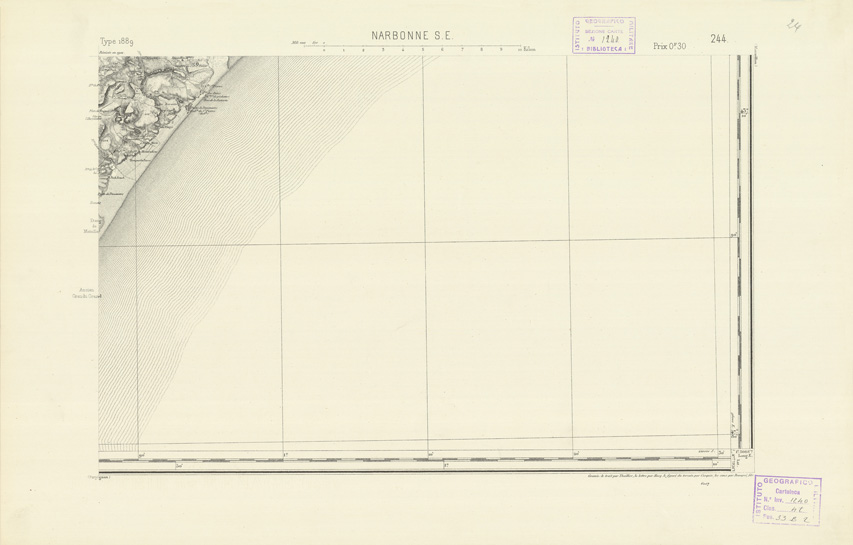 "Paris. Service Géographique de l'Armée, 1889. Ebbe origine dall'Edizione zincografica in quarti di foglio, stabilita dal 1879, per la carta detta de "L'Etat-Major". Infatti non rispondono più il sistema della riproduzione zincografica alle esigenze che la revisione dei fogli imponeva, per un inevitabile logoramento dei rami originali, fu proposta dapprima la correzione degli zinchi, ma questo, importando un lavoro lungo e gravoso, si adottò il procedimento galvanico. I rami galvanici ottenuti e corretti secondo questo sistema presero il nome di "édition type 1889". Allo scopo di facilitare l'incisione fu adoperata la suddivisione in quarti di foglio come per l'edizione zincografica. La revisione dei fogli di questo tipo non fu iniziata che nel 1893. Dal catalogo del S.G.A. risultano mancanti a questa edizione i dipartimenti della "Moselle", del "Bas-Rhin" e del "Haut-Rhin" per i quali non esiste che una edizione in fogli interi aggiornata nel 1901."