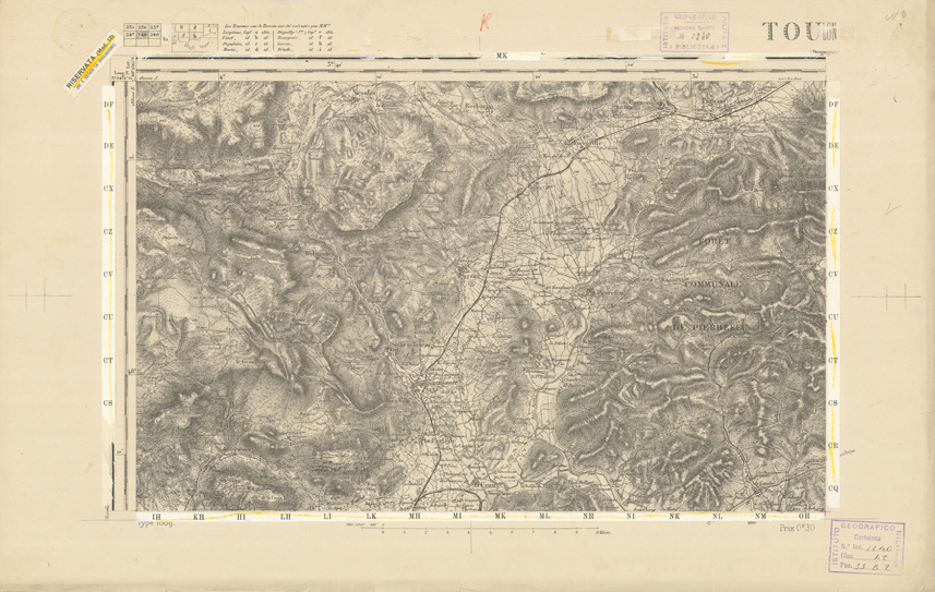 "Paris. Service Géographique de l'Armée, 1889. Ebbe origine dall'Edizione zincografica in quarti di foglio, stabilita dal 1879, per la carta detta de "L'Etat-Major". Infatti non rispondono più il sistema della riproduzione zincografica alle esigenze che la revisione dei fogli imponeva, per un inevitabile logoramento dei rami originali, fu proposta dapprima la correzione degli zinchi, ma questo, importando un lavoro lungo e gravoso, si adottò il procedimento galvanico. I rami galvanici ottenuti e corretti secondo questo sistema presero il nome di "édition type 1889". Allo scopo di facilitare l'incisione fu adoperata la suddivisione in quarti di foglio come per l'edizione zincografica. La revisione dei fogli di questo tipo non fu iniziata che nel 1893. Dal catalogo del S.G.A. risultano mancanti a questa edizione i dipartimenti della "Moselle", del "Bas-Rhin" e del "Haut-Rhin" per i quali non esiste che una edizione in fogli interi aggiornata nel 1901."
