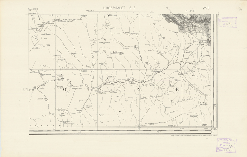 "Paris. Service Géographique de l'Armée, 1889. Ebbe origine dall'Edizione zincografica in quarti di foglio, stabilita dal 1879, per la carta detta de "L'Etat-Major". Infatti non rispondono più il sistema della riproduzione zincografica alle esigenze che la revisione dei fogli imponeva, per un inevitabile logoramento dei rami originali, fu proposta dapprima la correzione degli zinchi, ma questo, importando un lavoro lungo e gravoso, si adottò il procedimento galvanico. I rami galvanici ottenuti e corretti secondo questo sistema presero il nome di "édition type 1889". Allo scopo di facilitare l'incisione fu adoperata la suddivisione in quarti di foglio come per l'edizione zincografica. La revisione dei fogli di questo tipo non fu iniziata che nel 1893. Dal catalogo del S.G.A. risultano mancanti a questa edizione i dipartimenti della "Moselle", del "Bas-Rhin" e del "Haut-Rhin" per i quali non esiste che una edizione in fogli interi aggiornata nel 1901."