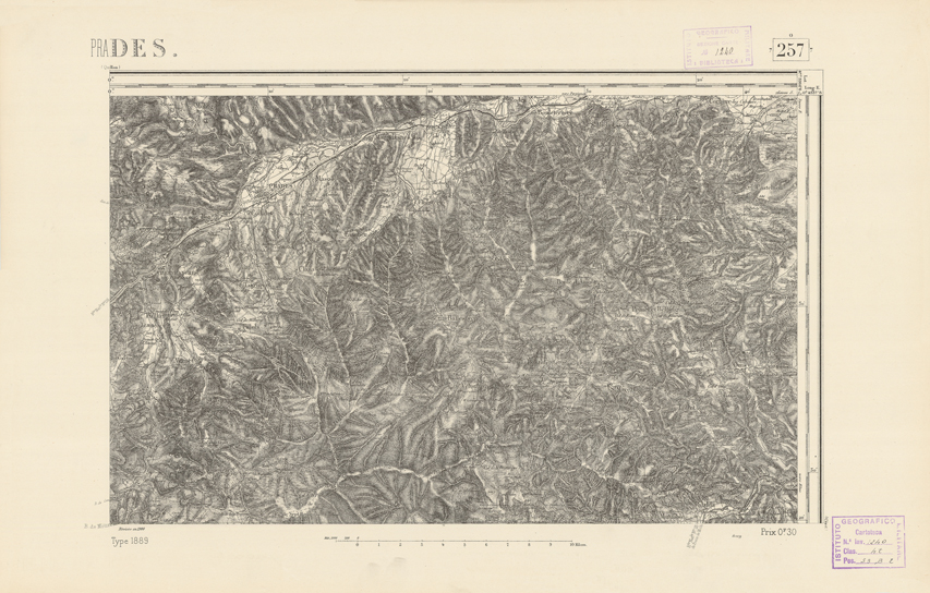 "Paris. Service Géographique de l'Armée, 1889. Ebbe origine dall'Edizione zincografica in quarti di foglio, stabilita dal 1879, per la carta detta de "L'Etat-Major". Infatti non rispondono più il sistema della riproduzione zincografica alle esigenze che la revisione dei fogli imponeva, per un inevitabile logoramento dei rami originali, fu proposta dapprima la correzione degli zinchi, ma questo, importando un lavoro lungo e gravoso, si adottò il procedimento galvanico. I rami galvanici ottenuti e corretti secondo questo sistema presero il nome di "édition type 1889". Allo scopo di facilitare l'incisione fu adoperata la suddivisione in quarti di foglio come per l'edizione zincografica. La revisione dei fogli di questo tipo non fu iniziata che nel 1893. Dal catalogo del S.G.A. risultano mancanti a questa edizione i dipartimenti della "Moselle", del "Bas-Rhin" e del "Haut-Rhin" per i quali non esiste che una edizione in fogli interi aggiornata nel 1901."