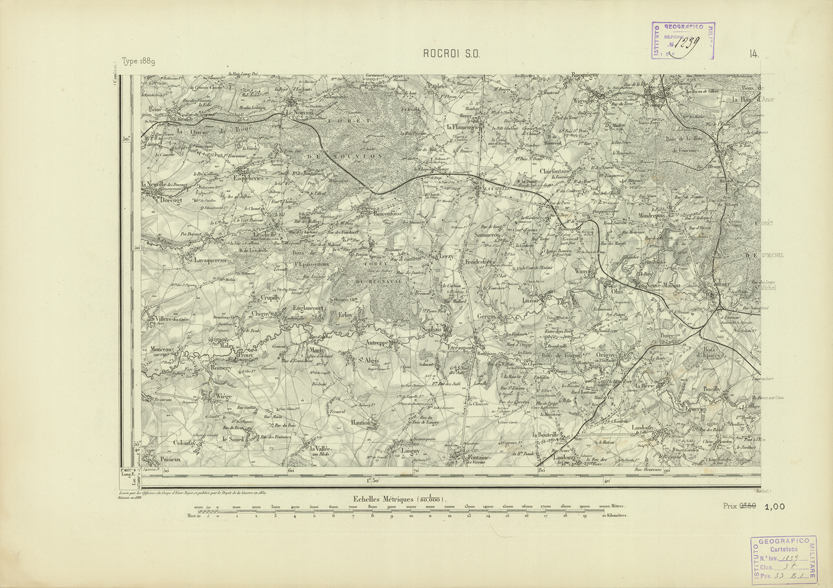 "Paris. - Service Géograèhique de l'Armée, 1889. Ebbe origine dall'Edizione zincografica in quarti di foglio, stabilita fino dal 1879, per la Carta detta de "L'etat-Major". Infatti non rispondendo più il sistema della riproduzione zincografica alle esigenze che la revisione dei fogli imponeva per un inevitabile logoramento dei rami originali, fu proposta dapprima la correzione degli zinchi, ma questo, importando un lavoro lungo e gravoso, si adottò il procedimento galvanico. I rami galvanici ottenuti e corretti secondo questo sistema presero il nome di "édition type 1889". Allo scopo di facilitare l'incisione fu adoperata la suddivisione in quarti di foglio come per l'edizione zincografica. la revisione dei fogli di questo tipo nnn fu iniziata che nel 1893. Dal catalogo del S.G.A. risultano mancanti a questa edizione i dipartimenti della "Moselle", del "Bas-Rhin" e del "Haut-Rhin" per le quali non esiste che una edizione in fogli interi aggiornata nel 1901."