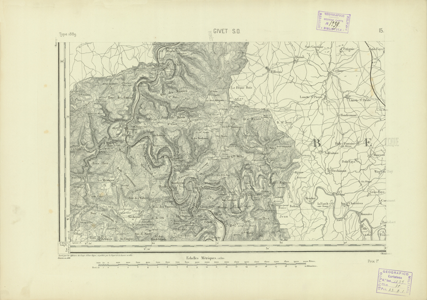 "Paris. - Service Géograèhique de l'Armée, 1889. Ebbe origine dall'Edizione zincografica in quarti di foglio, stabilita fino dal 1879, per la Carta detta de "L'etat-Major". Infatti non rispondendo più il sistema della riproduzione zincografica alle esigenze che la revisione dei fogli imponeva per un inevitabile logoramento dei rami originali, fu proposta dapprima la correzione degli zinchi, ma questo, importando un lavoro lungo e gravoso, si adottò il procedimento galvanico. I rami galvanici ottenuti e corretti secondo questo sistema presero il nome di "édition type 1889". Allo scopo di facilitare l'incisione fu adoperata la suddivisione in quarti di foglio come per l'edizione zincografica. la revisione dei fogli di questo tipo nnn fu iniziata che nel 1893. Dal catalogo del S.G.A. risultano mancanti a questa edizione i dipartimenti della "Moselle", del "Bas-Rhin" e del "Haut-Rhin" per le quali non esiste che una edizione in fogli interi aggiornata nel 1901."