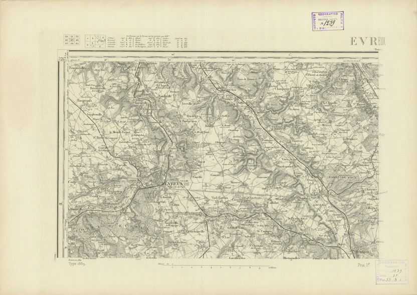 "Paris. - Service Géograèhique de l'Armée, 1889. Ebbe origine dall'Edizione zincografica in quarti di foglio, stabilita fino dal 1879, per la Carta detta de "L'etat-Major". Infatti non rispondendo più il sistema della riproduzione zincografica alle esigenze che la revisione dei fogli imponeva per un inevitabile logoramento dei rami originali, fu proposta dapprima la correzione degli zinchi, ma questo, importando un lavoro lungo e gravoso, si adottò il procedimento galvanico. I rami galvanici ottenuti e corretti secondo questo sistema presero il nome di "édition type 1889". Allo scopo di facilitare l'incisione fu adoperata la suddivisione in quarti di foglio come per l'edizione zincografica. la revisione dei fogli di questo tipo nnn fu iniziata che nel 1893. Dal catalogo del S.G.A. risultano mancanti a questa edizione i dipartimenti della "Moselle", del "Bas-Rhin" e del "Haut-Rhin" per le quali non esiste che una edizione in fogli interi aggiornata nel 1901."