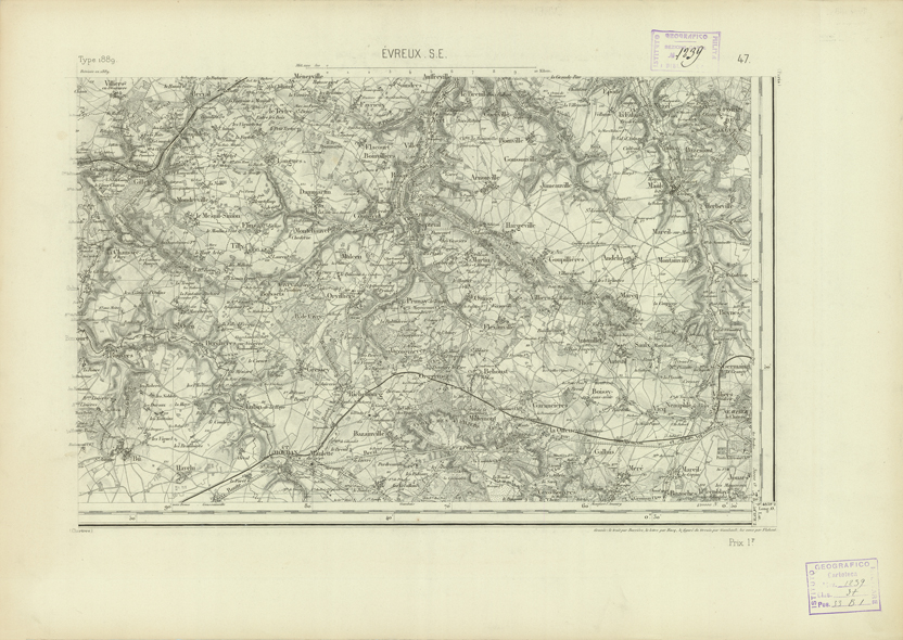 "Paris. - Service Géograèhique de l'Armée, 1889. Ebbe origine dall'Edizione zincografica in quarti di foglio, stabilita fino dal 1879, per la Carta detta de "L'etat-Major". Infatti non rispondendo più il sistema della riproduzione zincografica alle esigenze che la revisione dei fogli imponeva per un inevitabile logoramento dei rami originali, fu proposta dapprima la correzione degli zinchi, ma questo, importando un lavoro lungo e gravoso, si adottò il procedimento galvanico. I rami galvanici ottenuti e corretti secondo questo sistema presero il nome di "édition type 1889". Allo scopo di facilitare l'incisione fu adoperata la suddivisione in quarti di foglio come per l'edizione zincografica. la revisione dei fogli di questo tipo nnn fu iniziata che nel 1893. Dal catalogo del S.G.A. risultano mancanti a questa edizione i dipartimenti della "Moselle", del "Bas-Rhin" e del "Haut-Rhin" per le quali non esiste che una edizione in fogli interi aggiornata nel 1901."