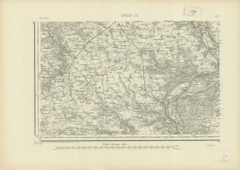 "Paris. - Service Géograèhique de l'Armée, 1889. Ebbe origine dall'Edizione zincografica in quarti di foglio, stabilita fino dal 1879, per la Carta detta de "L'etat-Major". Infatti non rispondendo più il sistema della riproduzione zincografica alle esigenze che la revisione dei fogli imponeva per un inevitabile logoramento dei rami originali, fu proposta dapprima la correzione degli zinchi, ma questo, importando un lavoro lungo e gravoso, si adottò il procedimento galvanico. I rami galvanici ottenuti e corretti secondo questo sistema presero il nome di "édition type 1889". Allo scopo di facilitare l'incisione fu adoperata la suddivisione in quarti di foglio come per l'edizione zincografica. la revisione dei fogli di questo tipo nnn fu iniziata che nel 1893. Dal catalogo del S.G.A. risultano mancanti a questa edizione i dipartimenti della "Moselle", del "Bas-Rhin" e del "Haut-Rhin" per le quali non esiste che una edizione in fogli interi aggiornata nel 1901."
