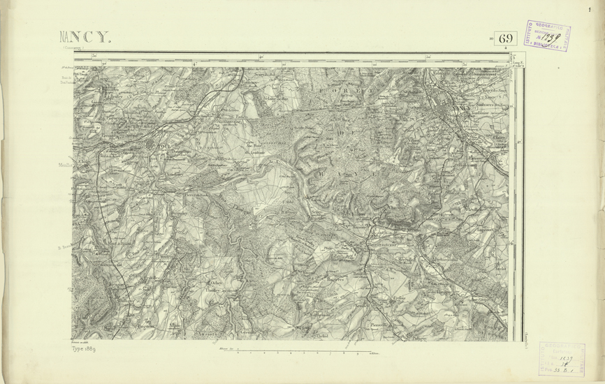 "Paris. - Service Géograèhique de l'Armée, 1889. Ebbe origine dall'Edizione zincografica in quarti di foglio, stabilita fino dal 1879, per la Carta detta de "L'etat-Major". Infatti non rispondendo più il sistema della riproduzione zincografica alle esigenze che la revisione dei fogli imponeva per un inevitabile logoramento dei rami originali, fu proposta dapprima la correzione degli zinchi, ma questo, importando un lavoro lungo e gravoso, si adottò il procedimento galvanico. I rami galvanici ottenuti e corretti secondo questo sistema presero il nome di "édition type 1889". Allo scopo di facilitare l'incisione fu adoperata la suddivisione in quarti di foglio come per l'edizione zincografica. la revisione dei fogli di questo tipo nnn fu iniziata che nel 1893. Dal catalogo del S.G.A. risultano mancanti a questa edizione i dipartimenti della "Moselle", del "Bas-Rhin" e del "Haut-Rhin" per le quali non esiste che una edizione in fogli interi aggiornata nel 1901."