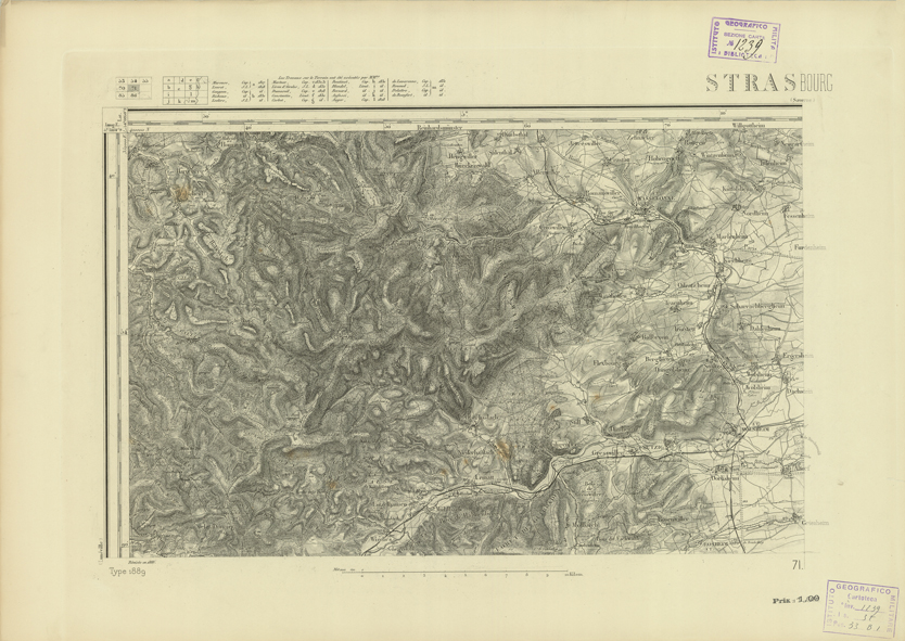 "Paris. - Service Géograèhique de l'Armée, 1889. Ebbe origine dall'Edizione zincografica in quarti di foglio, stabilita fino dal 1879, per la Carta detta de "L'etat-Major". Infatti non rispondendo più il sistema della riproduzione zincografica alle esigenze che la revisione dei fogli imponeva per un inevitabile logoramento dei rami originali, fu proposta dapprima la correzione degli zinchi, ma questo, importando un lavoro lungo e gravoso, si adottò il procedimento galvanico. I rami galvanici ottenuti e corretti secondo questo sistema presero il nome di "édition type 1889". Allo scopo di facilitare l'incisione fu adoperata la suddivisione in quarti di foglio come per l'edizione zincografica. la revisione dei fogli di questo tipo nnn fu iniziata che nel 1893. Dal catalogo del S.G.A. risultano mancanti a questa edizione i dipartimenti della "Moselle", del "Bas-Rhin" e del "Haut-Rhin" per le quali non esiste che una edizione in fogli interi aggiornata nel 1901."