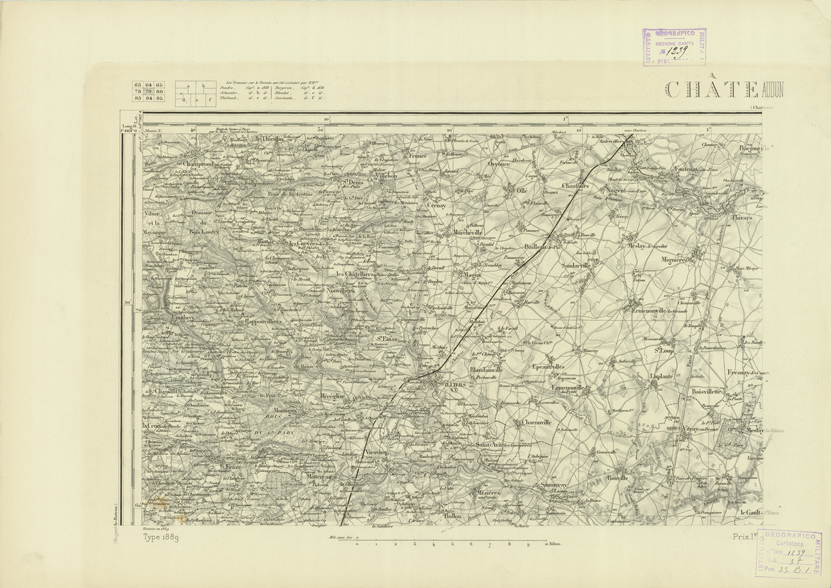 "Paris. - Service Géograèhique de l'Armée, 1889. Ebbe origine dall'Edizione zincografica in quarti di foglio, stabilita fino dal 1879, per la Carta detta de "L'etat-Major". Infatti non rispondendo più il sistema della riproduzione zincografica alle esigenze che la revisione dei fogli imponeva per un inevitabile logoramento dei rami originali, fu proposta dapprima la correzione degli zinchi, ma questo, importando un lavoro lungo e gravoso, si adottò il procedimento galvanico. I rami galvanici ottenuti e corretti secondo questo sistema presero il nome di "édition type 1889". Allo scopo di facilitare l'incisione fu adoperata la suddivisione in quarti di foglio come per l'edizione zincografica. la revisione dei fogli di questo tipo nnn fu iniziata che nel 1893. Dal catalogo del S.G.A. risultano mancanti a questa edizione i dipartimenti della "Moselle", del "Bas-Rhin" e del "Haut-Rhin" per le quali non esiste che una edizione in fogli interi aggiornata nel 1901."