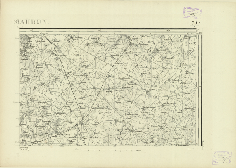 "Paris. - Service Géograèhique de l'Armée, 1889. Ebbe origine dall'Edizione zincografica in quarti di foglio, stabilita fino dal 1879, per la Carta detta de "L'etat-Major". Infatti non rispondendo più il sistema della riproduzione zincografica alle esigenze che la revisione dei fogli imponeva per un inevitabile logoramento dei rami originali, fu proposta dapprima la correzione degli zinchi, ma questo, importando un lavoro lungo e gravoso, si adottò il procedimento galvanico. I rami galvanici ottenuti e corretti secondo questo sistema presero il nome di "édition type 1889". Allo scopo di facilitare l'incisione fu adoperata la suddivisione in quarti di foglio come per l'edizione zincografica. la revisione dei fogli di questo tipo nnn fu iniziata che nel 1893. Dal catalogo del S.G.A. risultano mancanti a questa edizione i dipartimenti della "Moselle", del "Bas-Rhin" e del "Haut-Rhin" per le quali non esiste che una edizione in fogli interi aggiornata nel 1901."