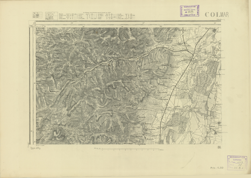 "Paris. - Service Géograèhique de l'Armée, 1889. Ebbe origine dall'Edizione zincografica in quarti di foglio, stabilita fino dal 1879, per la Carta detta de "L'etat-Major". Infatti non rispondendo più il sistema della riproduzione zincografica alle esigenze che la revisione dei fogli imponeva per un inevitabile logoramento dei rami originali, fu proposta dapprima la correzione degli zinchi, ma questo, importando un lavoro lungo e gravoso, si adottò il procedimento galvanico. I rami galvanici ottenuti e corretti secondo questo sistema presero il nome di "édition type 1889". Allo scopo di facilitare l'incisione fu adoperata la suddivisione in quarti di foglio come per l'edizione zincografica. la revisione dei fogli di questo tipo nnn fu iniziata che nel 1893. Dal catalogo del S.G.A. risultano mancanti a questa edizione i dipartimenti della "Moselle", del "Bas-Rhin" e del "Haut-Rhin" per le quali non esiste che una edizione in fogli interi aggiornata nel 1901."