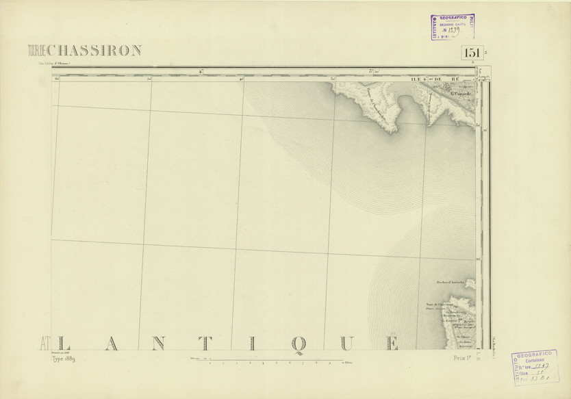 "Paris. - Service Géograèhique de l'Armée, 1889. Ebbe origine dall'Edizione zincografica in quarti di foglio, stabilita fino dal 1879, per la Carta detta de "L'etat-Major". Infatti non rispondendo più il sistema della riproduzione zincografica alle esigenze che la revisione dei fogli imponeva per un inevitabile logoramento dei rami originali, fu proposta dapprima la correzione degli zinchi, ma questo, importando un lavoro lungo e gravoso, si adottò il procedimento galvanico. I rami galvanici ottenuti e corretti secondo questo sistema presero il nome di "édition type 1889". Allo scopo di facilitare l'incisione fu adoperata la suddivisione in quarti di foglio come per l'edizione zincografica. la revisione dei fogli di questo tipo nnn fu iniziata che nel 1893. Dal catalogo del S.G.A. risultano mancanti a questa edizione i dipartimenti della "Moselle", del "Bas-Rhin" e del "Haut-Rhin" per le quali non esiste che una edizione in fogli interi aggiornata nel 1901."