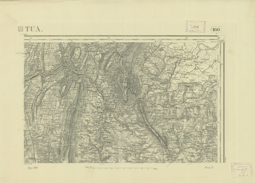 "Paris. - Service Géograèhique de l'Armée, 1889. Ebbe origine dall'Edizione zincografica in quarti di foglio, stabilita fino dal 1879, per la Carta detta de "L'etat-Major". Infatti non rispondendo più il sistema della riproduzione zincografica alle esigenze che la revisione dei fogli imponeva per un inevitabile logoramento dei rami originali, fu proposta dapprima la correzione degli zinchi, ma questo, importando un lavoro lungo e gravoso, si adottò il procedimento galvanico. I rami galvanici ottenuti e corretti secondo questo sistema presero il nome di "édition type 1889". Allo scopo di facilitare l'incisione fu adoperata la suddivisione in quarti di foglio come per l'edizione zincografica. la revisione dei fogli di questo tipo nnn fu iniziata che nel 1893. Dal catalogo del S.G.A. risultano mancanti a questa edizione i dipartimenti della "Moselle", del "Bas-Rhin" e del "Haut-Rhin" per le quali non esiste che una edizione in fogli interi aggiornata nel 1901."