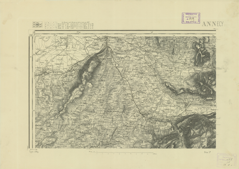 "Paris. - Service Géograèhique de l'Armée, 1889. Ebbe origine dall'Edizione zincografica in quarti di foglio, stabilita fino dal 1879, per la Carta detta de "L'etat-Major". Infatti non rispondendo più il sistema della riproduzione zincografica alle esigenze che la revisione dei fogli imponeva per un inevitabile logoramento dei rami originali, fu proposta dapprima la correzione degli zinchi, ma questo, importando un lavoro lungo e gravoso, si adottò il procedimento galvanico. I rami galvanici ottenuti e corretti secondo questo sistema presero il nome di "édition type 1889". Allo scopo di facilitare l'incisione fu adoperata la suddivisione in quarti di foglio come per l'edizione zincografica. la revisione dei fogli di questo tipo nnn fu iniziata che nel 1893. Dal catalogo del S.G.A. risultano mancanti a questa edizione i dipartimenti della "Moselle", del "Bas-Rhin" e del "Haut-Rhin" per le quali non esiste che una edizione in fogli interi aggiornata nel 1901."