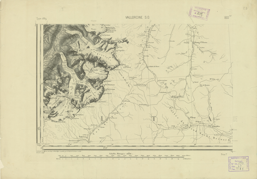 "Paris. - Service Géograèhique de l'Armée, 1889. Ebbe origine dall'Edizione zincografica in quarti di foglio, stabilita fino dal 1879, per la Carta detta de "L'etat-Major". Infatti non rispondendo più il sistema della riproduzione zincografica alle esigenze che la revisione dei fogli imponeva per un inevitabile logoramento dei rami originali, fu proposta dapprima la correzione degli zinchi, ma questo, importando un lavoro lungo e gravoso, si adottò il procedimento galvanico. I rami galvanici ottenuti e corretti secondo questo sistema presero il nome di "édition type 1889". Allo scopo di facilitare l'incisione fu adoperata la suddivisione in quarti di foglio come per l'edizione zincografica. la revisione dei fogli di questo tipo nnn fu iniziata che nel 1893. Dal catalogo del S.G.A. risultano mancanti a questa edizione i dipartimenti della "Moselle", del "Bas-Rhin" e del "Haut-Rhin" per le quali non esiste che una edizione in fogli interi aggiornata nel 1901."