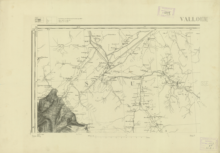 "Paris. - Service Géograèhique de l'Armée, 1889. Ebbe origine dall'Edizione zincografica in quarti di foglio, stabilita fino dal 1879, per la Carta detta de "L'etat-Major". Infatti non rispondendo più il sistema della riproduzione zincografica alle esigenze che la revisione dei fogli imponeva per un inevitabile logoramento dei rami originali, fu proposta dapprima la correzione degli zinchi, ma questo, importando un lavoro lungo e gravoso, si adottò il procedimento galvanico. I rami galvanici ottenuti e corretti secondo questo sistema presero il nome di "édition type 1889". Allo scopo di facilitare l'incisione fu adoperata la suddivisione in quarti di foglio come per l'edizione zincografica. la revisione dei fogli di questo tipo nnn fu iniziata che nel 1893. Dal catalogo del S.G.A. risultano mancanti a questa edizione i dipartimenti della "Moselle", del "Bas-Rhin" e del "Haut-Rhin" per le quali non esiste che una edizione in fogli interi aggiornata nel 1901."