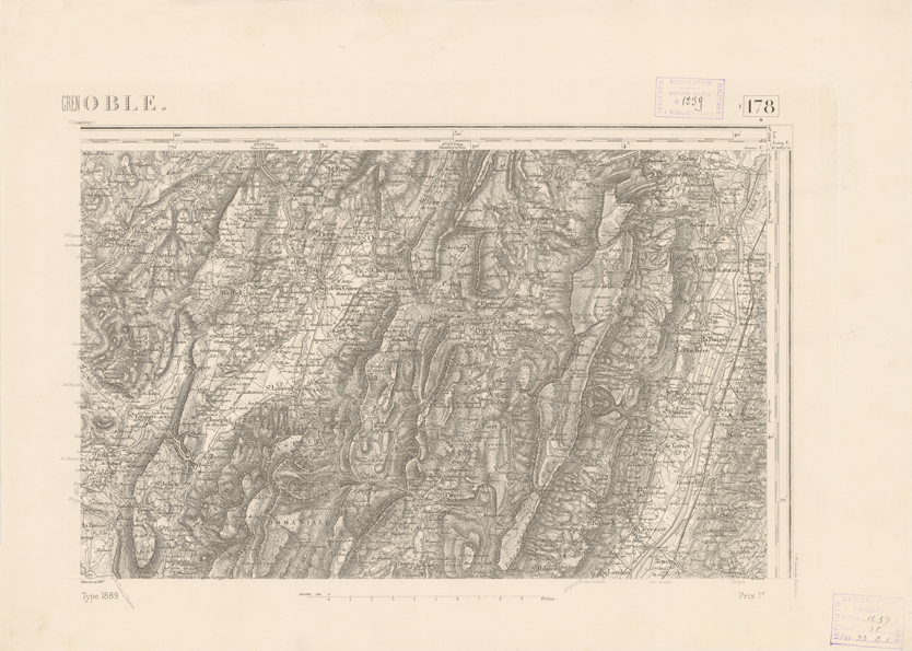 "Paris. - Service Géograèhique de l'Armée, 1889. Ebbe origine dall'Edizione zincografica in quarti di foglio, stabilita fino dal 1879, per la Carta detta de "L'etat-Major". Infatti non rispondendo più il sistema della riproduzione zincografica alle esigenze che la revisione dei fogli imponeva per un inevitabile logoramento dei rami originali, fu proposta dapprima la correzione degli zinchi, ma questo, importando un lavoro lungo e gravoso, si adottò il procedimento galvanico. I rami galvanici ottenuti e corretti secondo questo sistema presero il nome di "édition type 1889". Allo scopo di facilitare l'incisione fu adoperata la suddivisione in quarti di foglio come per l'edizione zincografica. la revisione dei fogli di questo tipo nnn fu iniziata che nel 1893. Dal catalogo del S.G.A. risultano mancanti a questa edizione i dipartimenti della "Moselle", del "Bas-Rhin" e del "Haut-Rhin" per le quali non esiste che una edizione in fogli interi aggiornata nel 1901."