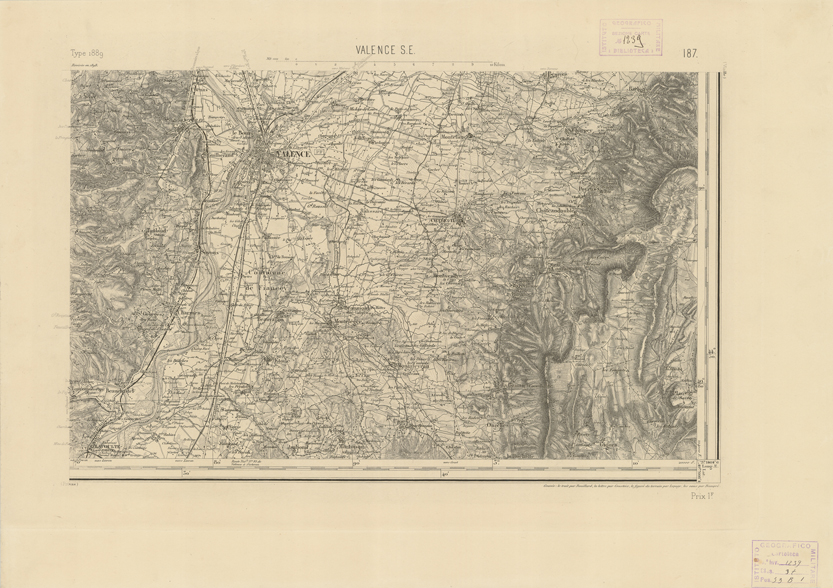 "Paris. - Service Géograèhique de l'Armée, 1889. Ebbe origine dall'Edizione zincografica in quarti di foglio, stabilita fino dal 1879, per la Carta detta de "L'etat-Major". Infatti non rispondendo più il sistema della riproduzione zincografica alle esigenze che la revisione dei fogli imponeva per un inevitabile logoramento dei rami originali, fu proposta dapprima la correzione degli zinchi, ma questo, importando un lavoro lungo e gravoso, si adottò il procedimento galvanico. I rami galvanici ottenuti e corretti secondo questo sistema presero il nome di "édition type 1889". Allo scopo di facilitare l'incisione fu adoperata la suddivisione in quarti di foglio come per l'edizione zincografica. la revisione dei fogli di questo tipo nnn fu iniziata che nel 1893. Dal catalogo del S.G.A. risultano mancanti a questa edizione i dipartimenti della "Moselle", del "Bas-Rhin" e del "Haut-Rhin" per le quali non esiste che una edizione in fogli interi aggiornata nel 1901."