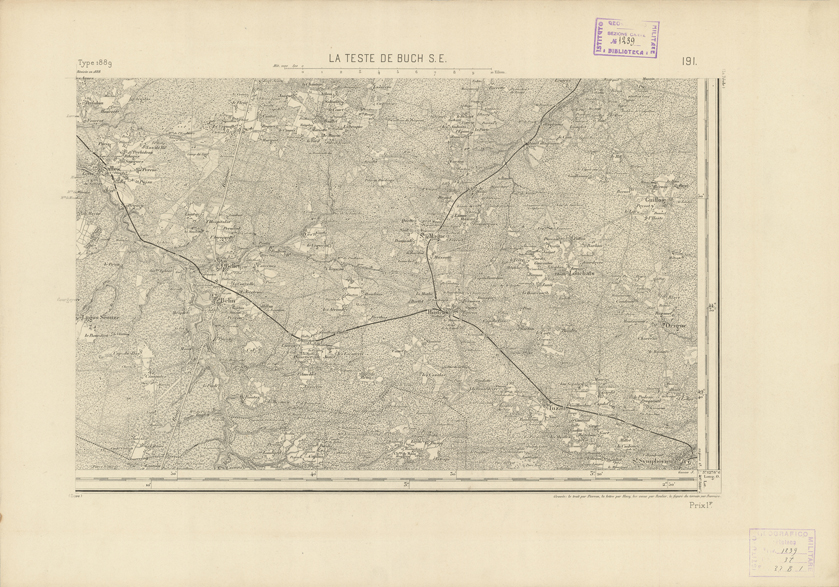 "Paris. - Service Géograèhique de l'Armée, 1889. Ebbe origine dall'Edizione zincografica in quarti di foglio, stabilita fino dal 1879, per la Carta detta de "L'etat-Major". Infatti non rispondendo più il sistema della riproduzione zincografica alle esigenze che la revisione dei fogli imponeva per un inevitabile logoramento dei rami originali, fu proposta dapprima la correzione degli zinchi, ma questo, importando un lavoro lungo e gravoso, si adottò il procedimento galvanico. I rami galvanici ottenuti e corretti secondo questo sistema presero il nome di "édition type 1889". Allo scopo di facilitare l'incisione fu adoperata la suddivisione in quarti di foglio come per l'edizione zincografica. la revisione dei fogli di questo tipo nnn fu iniziata che nel 1893. Dal catalogo del S.G.A. risultano mancanti a questa edizione i dipartimenti della "Moselle", del "Bas-Rhin" e del "Haut-Rhin" per le quali non esiste che una edizione in fogli interi aggiornata nel 1901."