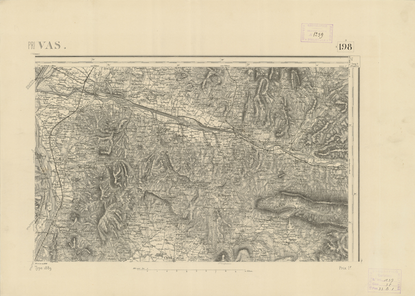 "Paris. - Service Géograèhique de l'Armée, 1889. Ebbe origine dall'Edizione zincografica in quarti di foglio, stabilita fino dal 1879, per la Carta detta de "L'etat-Major". Infatti non rispondendo più il sistema della riproduzione zincografica alle esigenze che la revisione dei fogli imponeva per un inevitabile logoramento dei rami originali, fu proposta dapprima la correzione degli zinchi, ma questo, importando un lavoro lungo e gravoso, si adottò il procedimento galvanico. I rami galvanici ottenuti e corretti secondo questo sistema presero il nome di "édition type 1889". Allo scopo di facilitare l'incisione fu adoperata la suddivisione in quarti di foglio come per l'edizione zincografica. la revisione dei fogli di questo tipo nnn fu iniziata che nel 1893. Dal catalogo del S.G.A. risultano mancanti a questa edizione i dipartimenti della "Moselle", del "Bas-Rhin" e del "Haut-Rhin" per le quali non esiste che una edizione in fogli interi aggiornata nel 1901."