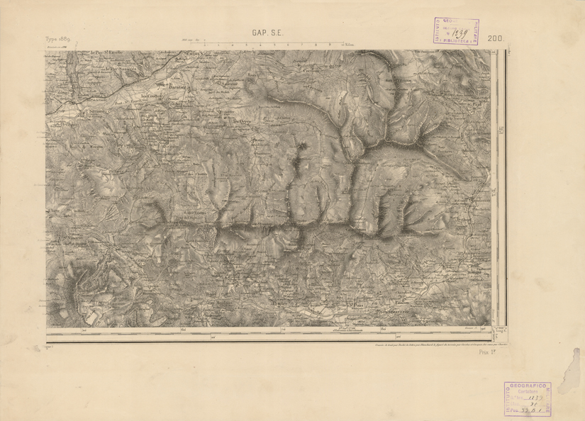"Paris. - Service Géograèhique de l'Armée, 1889. Ebbe origine dall'Edizione zincografica in quarti di foglio, stabilita fino dal 1879, per la Carta detta de "L'etat-Major". Infatti non rispondendo più il sistema della riproduzione zincografica alle esigenze che la revisione dei fogli imponeva per un inevitabile logoramento dei rami originali, fu proposta dapprima la correzione degli zinchi, ma questo, importando un lavoro lungo e gravoso, si adottò il procedimento galvanico. I rami galvanici ottenuti e corretti secondo questo sistema presero il nome di "édition type 1889". Allo scopo di facilitare l'incisione fu adoperata la suddivisione in quarti di foglio come per l'edizione zincografica. la revisione dei fogli di questo tipo nnn fu iniziata che nel 1893. Dal catalogo del S.G.A. risultano mancanti a questa edizione i dipartimenti della "Moselle", del "Bas-Rhin" e del "Haut-Rhin" per le quali non esiste che una edizione in fogli interi aggiornata nel 1901."