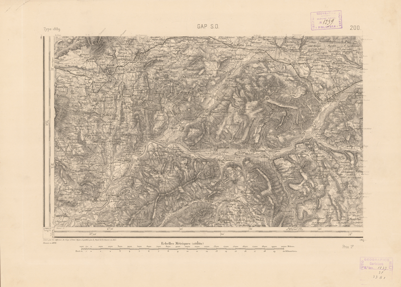 "Paris. - Service Géograèhique de l'Armée, 1889. Ebbe origine dall'Edizione zincografica in quarti di foglio, stabilita fino dal 1879, per la Carta detta de "L'etat-Major". Infatti non rispondendo più il sistema della riproduzione zincografica alle esigenze che la revisione dei fogli imponeva per un inevitabile logoramento dei rami originali, fu proposta dapprima la correzione degli zinchi, ma questo, importando un lavoro lungo e gravoso, si adottò il procedimento galvanico. I rami galvanici ottenuti e corretti secondo questo sistema presero il nome di "édition type 1889". Allo scopo di facilitare l'incisione fu adoperata la suddivisione in quarti di foglio come per l'edizione zincografica. la revisione dei fogli di questo tipo nnn fu iniziata che nel 1893. Dal catalogo del S.G.A. risultano mancanti a questa edizione i dipartimenti della "Moselle", del "Bas-Rhin" e del "Haut-Rhin" per le quali non esiste che una edizione in fogli interi aggiornata nel 1901."