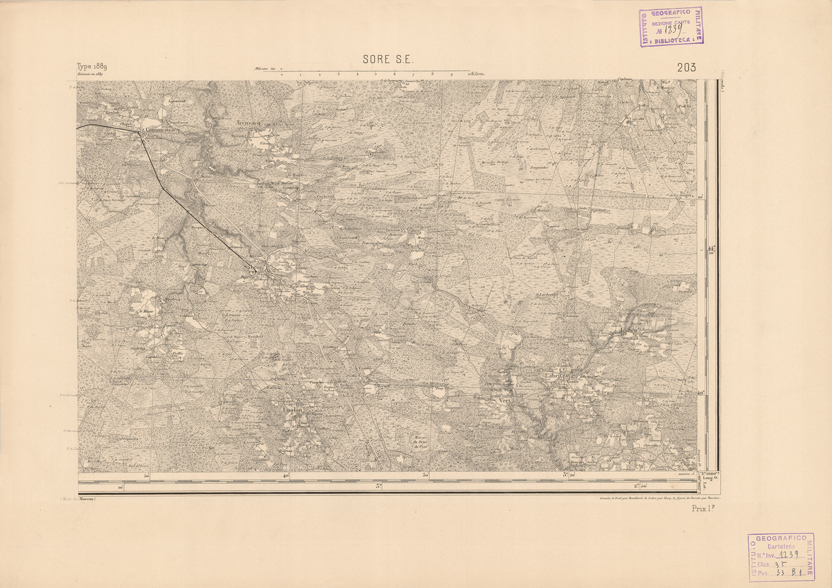 "Paris. - Service Géograèhique de l'Armée, 1889. Ebbe origine dall'Edizione zincografica in quarti di foglio, stabilita fino dal 1879, per la Carta detta de "L'etat-Major". Infatti non rispondendo più il sistema della riproduzione zincografica alle esigenze che la revisione dei fogli imponeva per un inevitabile logoramento dei rami originali, fu proposta dapprima la correzione degli zinchi, ma questo, importando un lavoro lungo e gravoso, si adottò il procedimento galvanico. I rami galvanici ottenuti e corretti secondo questo sistema presero il nome di "édition type 1889". Allo scopo di facilitare l'incisione fu adoperata la suddivisione in quarti di foglio come per l'edizione zincografica. la revisione dei fogli di questo tipo nnn fu iniziata che nel 1893. Dal catalogo del S.G.A. risultano mancanti a questa edizione i dipartimenti della "Moselle", del "Bas-Rhin" e del "Haut-Rhin" per le quali non esiste che una edizione in fogli interi aggiornata nel 1901."