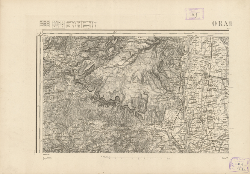 "Paris. - Service Géograèhique de l'Armée, 1889. Ebbe origine dall'Edizione zincografica in quarti di foglio, stabilita fino dal 1879, per la Carta detta de "L'etat-Major". Infatti non rispondendo più il sistema della riproduzione zincografica alle esigenze che la revisione dei fogli imponeva per un inevitabile logoramento dei rami originali, fu proposta dapprima la correzione degli zinchi, ma questo, importando un lavoro lungo e gravoso, si adottò il procedimento galvanico. I rami galvanici ottenuti e corretti secondo questo sistema presero il nome di "édition type 1889". Allo scopo di facilitare l'incisione fu adoperata la suddivisione in quarti di foglio come per l'edizione zincografica. la revisione dei fogli di questo tipo nnn fu iniziata che nel 1893. Dal catalogo del S.G.A. risultano mancanti a questa edizione i dipartimenti della "Moselle", del "Bas-Rhin" e del "Haut-Rhin" per le quali non esiste che una edizione in fogli interi aggiornata nel 1901."
