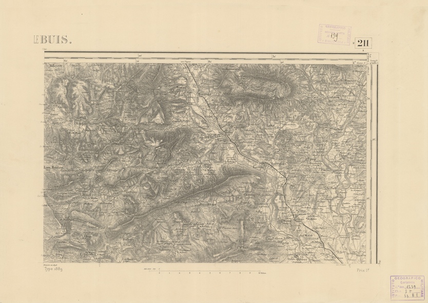 "Paris. - Service Géograèhique de l'Armée, 1889. Ebbe origine dall'Edizione zincografica in quarti di foglio, stabilita fino dal 1879, per la Carta detta de "L'etat-Major". Infatti non rispondendo più il sistema della riproduzione zincografica alle esigenze che la revisione dei fogli imponeva per un inevitabile logoramento dei rami originali, fu proposta dapprima la correzione degli zinchi, ma questo, importando un lavoro lungo e gravoso, si adottò il procedimento galvanico. I rami galvanici ottenuti e corretti secondo questo sistema presero il nome di "édition type 1889". Allo scopo di facilitare l'incisione fu adoperata la suddivisione in quarti di foglio come per l'edizione zincografica. la revisione dei fogli di questo tipo nnn fu iniziata che nel 1893. Dal catalogo del S.G.A. risultano mancanti a questa edizione i dipartimenti della "Moselle", del "Bas-Rhin" e del "Haut-Rhin" per le quali non esiste che una edizione in fogli interi aggiornata nel 1901."