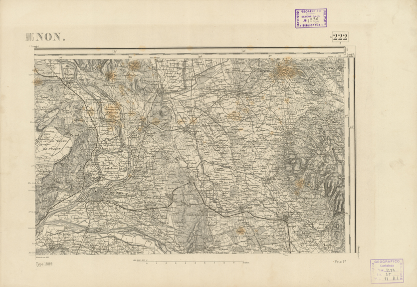 "Paris. - Service Géograèhique de l'Armée, 1889. Ebbe origine dall'Edizione zincografica in quarti di foglio, stabilita fino dal 1879, per la Carta detta de "L'etat-Major". Infatti non rispondendo più il sistema della riproduzione zincografica alle esigenze che la revisione dei fogli imponeva per un inevitabile logoramento dei rami originali, fu proposta dapprima la correzione degli zinchi, ma questo, importando un lavoro lungo e gravoso, si adottò il procedimento galvanico. I rami galvanici ottenuti e corretti secondo questo sistema presero il nome di "édition type 1889". Allo scopo di facilitare l'incisione fu adoperata la suddivisione in quarti di foglio come per l'edizione zincografica. la revisione dei fogli di questo tipo nnn fu iniziata che nel 1893. Dal catalogo del S.G.A. risultano mancanti a questa edizione i dipartimenti della "Moselle", del "Bas-Rhin" e del "Haut-Rhin" per le quali non esiste che una edizione in fogli interi aggiornata nel 1901."