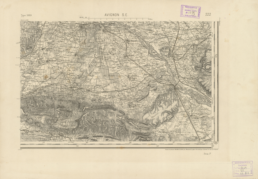 "Paris. - Service Géograèhique de l'Armée, 1889. Ebbe origine dall'Edizione zincografica in quarti di foglio, stabilita fino dal 1879, per la Carta detta de "L'etat-Major". Infatti non rispondendo più il sistema della riproduzione zincografica alle esigenze che la revisione dei fogli imponeva per un inevitabile logoramento dei rami originali, fu proposta dapprima la correzione degli zinchi, ma questo, importando un lavoro lungo e gravoso, si adottò il procedimento galvanico. I rami galvanici ottenuti e corretti secondo questo sistema presero il nome di "édition type 1889". Allo scopo di facilitare l'incisione fu adoperata la suddivisione in quarti di foglio come per l'edizione zincografica. la revisione dei fogli di questo tipo nnn fu iniziata che nel 1893. Dal catalogo del S.G.A. risultano mancanti a questa edizione i dipartimenti della "Moselle", del "Bas-Rhin" e del "Haut-Rhin" per le quali non esiste che una edizione in fogli interi aggiornata nel 1901."