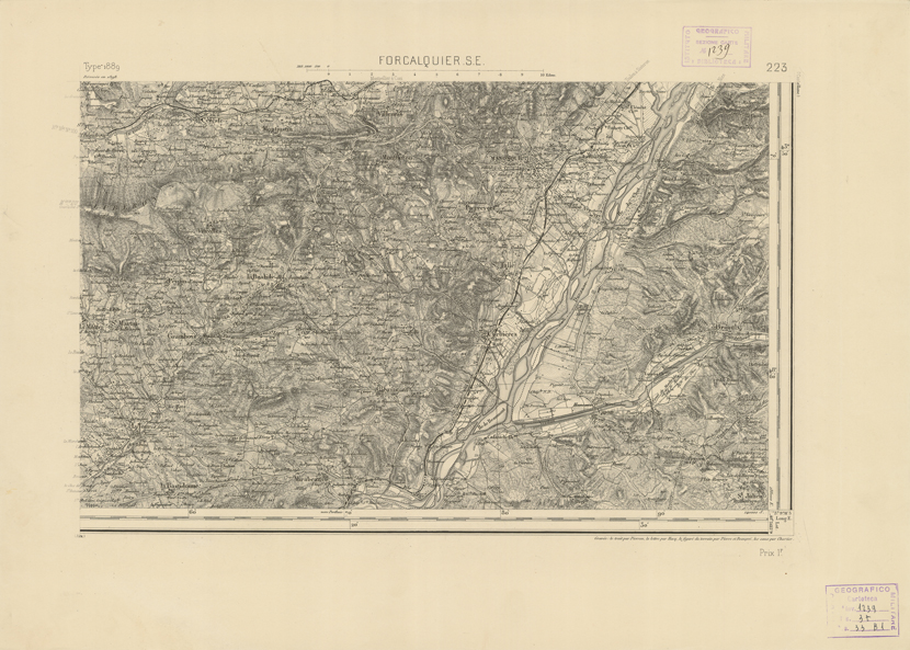 "Paris. - Service Géograèhique de l'Armée, 1889. Ebbe origine dall'Edizione zincografica in quarti di foglio, stabilita fino dal 1879, per la Carta detta de "L'etat-Major". Infatti non rispondendo più il sistema della riproduzione zincografica alle esigenze che la revisione dei fogli imponeva per un inevitabile logoramento dei rami originali, fu proposta dapprima la correzione degli zinchi, ma questo, importando un lavoro lungo e gravoso, si adottò il procedimento galvanico. I rami galvanici ottenuti e corretti secondo questo sistema presero il nome di "édition type 1889". Allo scopo di facilitare l'incisione fu adoperata la suddivisione in quarti di foglio come per l'edizione zincografica. la revisione dei fogli di questo tipo nnn fu iniziata che nel 1893. Dal catalogo del S.G.A. risultano mancanti a questa edizione i dipartimenti della "Moselle", del "Bas-Rhin" e del "Haut-Rhin" per le quali non esiste che una edizione in fogli interi aggiornata nel 1901."