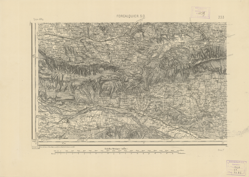 "Paris. - Service Géograèhique de l'Armée, 1889. Ebbe origine dall'Edizione zincografica in quarti di foglio, stabilita fino dal 1879, per la Carta detta de "L'etat-Major". Infatti non rispondendo più il sistema della riproduzione zincografica alle esigenze che la revisione dei fogli imponeva per un inevitabile logoramento dei rami originali, fu proposta dapprima la correzione degli zinchi, ma questo, importando un lavoro lungo e gravoso, si adottò il procedimento galvanico. I rami galvanici ottenuti e corretti secondo questo sistema presero il nome di "édition type 1889". Allo scopo di facilitare l'incisione fu adoperata la suddivisione in quarti di foglio come per l'edizione zincografica. la revisione dei fogli di questo tipo nnn fu iniziata che nel 1893. Dal catalogo del S.G.A. risultano mancanti a questa edizione i dipartimenti della "Moselle", del "Bas-Rhin" e del "Haut-Rhin" per le quali non esiste che una edizione in fogli interi aggiornata nel 1901."