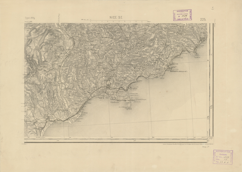 "Paris. - Service Géograèhique de l'Armée, 1889. Ebbe origine dall'Edizione zincografica in quarti di foglio, stabilita fino dal 1879, per la Carta detta de "L'etat-Major". Infatti non rispondendo più il sistema della riproduzione zincografica alle esigenze che la revisione dei fogli imponeva per un inevitabile logoramento dei rami originali, fu proposta dapprima la correzione degli zinchi, ma questo, importando un lavoro lungo e gravoso, si adottò il procedimento galvanico. I rami galvanici ottenuti e corretti secondo questo sistema presero il nome di "édition type 1889". Allo scopo di facilitare l'incisione fu adoperata la suddivisione in quarti di foglio come per l'edizione zincografica. la revisione dei fogli di questo tipo nnn fu iniziata che nel 1893. Dal catalogo del S.G.A. risultano mancanti a questa edizione i dipartimenti della "Moselle", del "Bas-Rhin" e del "Haut-Rhin" per le quali non esiste che una edizione in fogli interi aggiornata nel 1901."