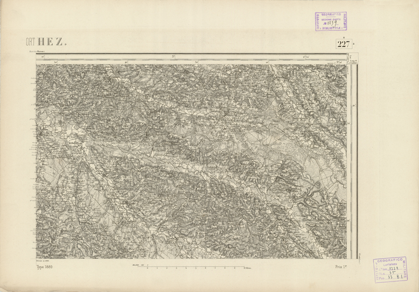 "Paris. - Service Géograèhique de l'Armée, 1889. Ebbe origine dall'Edizione zincografica in quarti di foglio, stabilita fino dal 1879, per la Carta detta de "L'etat-Major". Infatti non rispondendo più il sistema della riproduzione zincografica alle esigenze che la revisione dei fogli imponeva per un inevitabile logoramento dei rami originali, fu proposta dapprima la correzione degli zinchi, ma questo, importando un lavoro lungo e gravoso, si adottò il procedimento galvanico. I rami galvanici ottenuti e corretti secondo questo sistema presero il nome di "édition type 1889". Allo scopo di facilitare l'incisione fu adoperata la suddivisione in quarti di foglio come per l'edizione zincografica. la revisione dei fogli di questo tipo nnn fu iniziata che nel 1893. Dal catalogo del S.G.A. risultano mancanti a questa edizione i dipartimenti della "Moselle", del "Bas-Rhin" e del "Haut-Rhin" per le quali non esiste che una edizione in fogli interi aggiornata nel 1901."